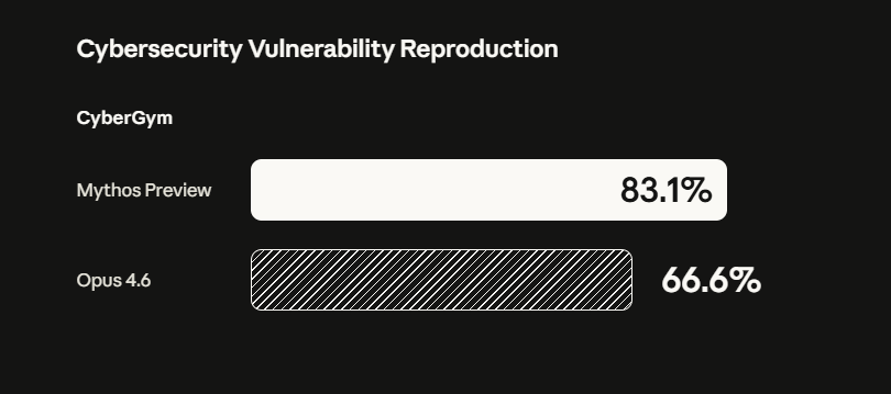 - CyberGym (vulnerability reproduction): Opus 4.6 scored 66.6%. Mythos scored 83.1%