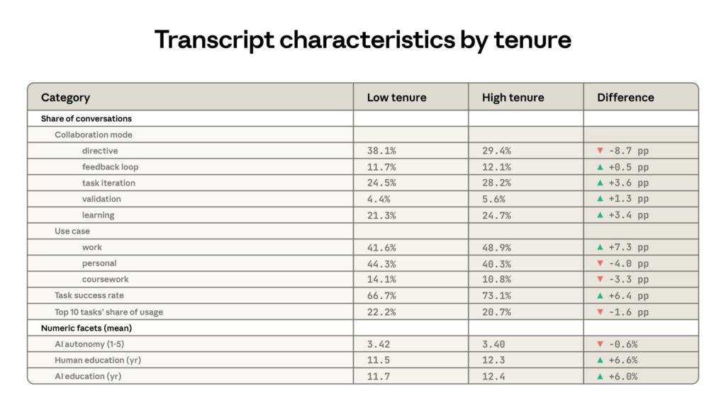 - They use it to learn: High-tenure users are more likely to engage with Claude as a thinking partner rather than an oracle.