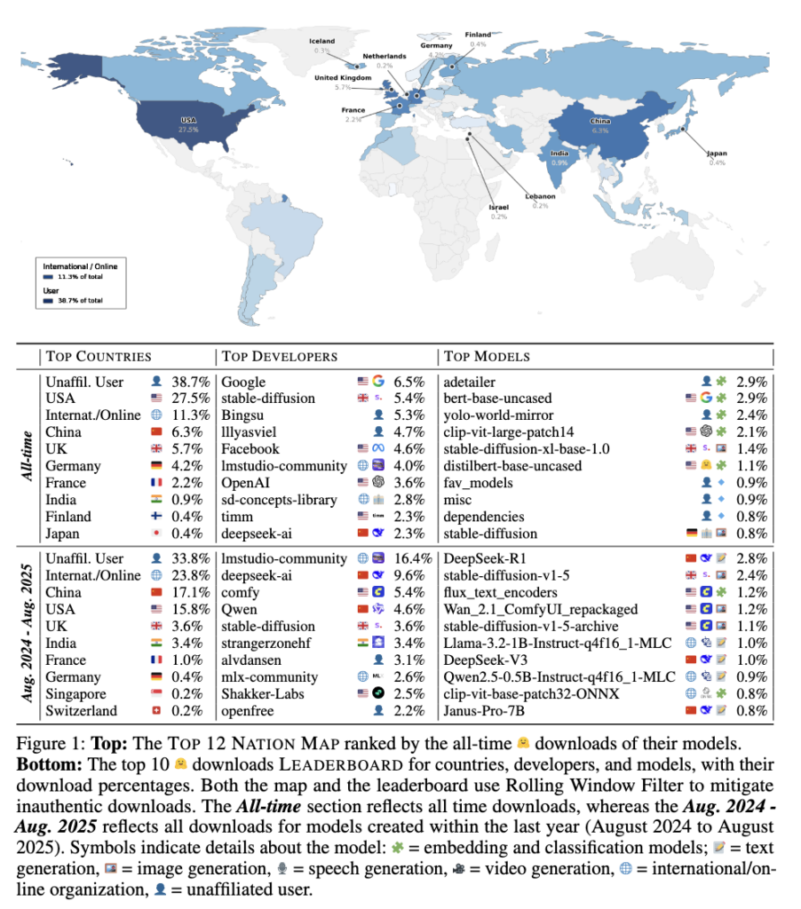 - The corporate decline: Tech giants are losing their grip on model development. Their share of overall development dropped from 70 percent to just 37 percent. Independent developers now drive a massive chunk of all downloads.
