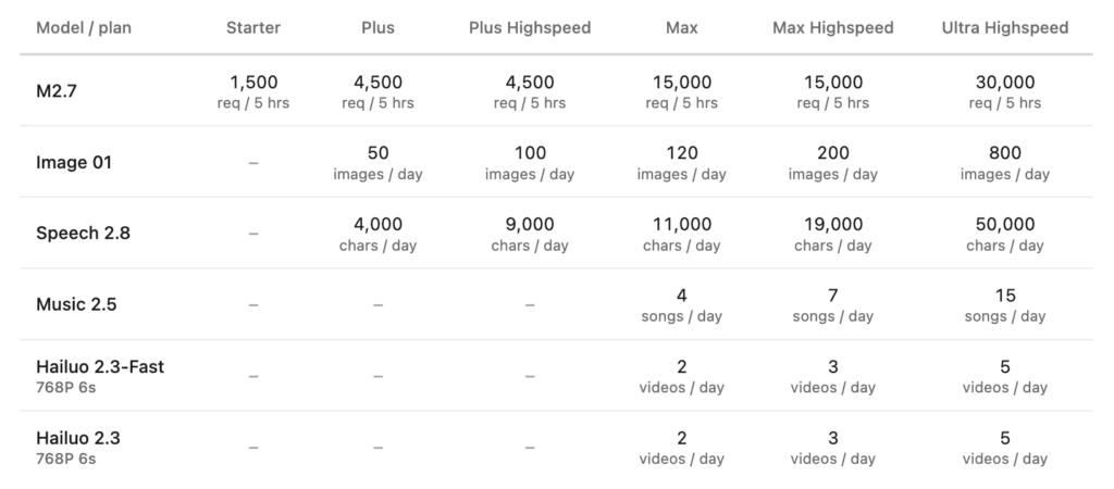 - Ultra Highspeed — $150/month: 30,000 M2.7 requests. Image 01 at 800/day, Speech 2.8 at 50,000 chars/day, Music 2.5 at 15 songs/day, Hailuo 2.3 at 5 videos/day.